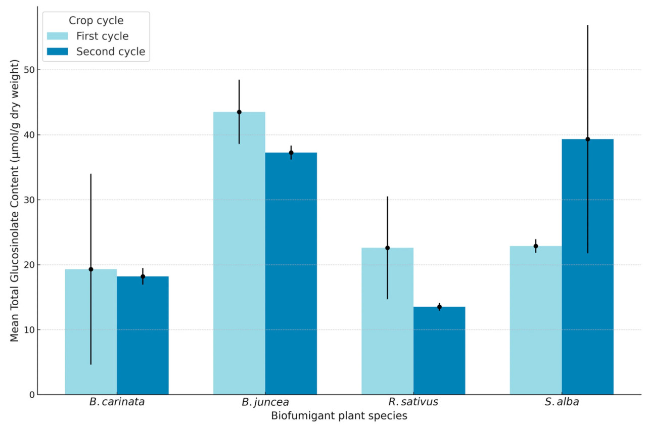 Продуктивность биомассы варьировала в зависимости от вида и даты отбора проб: S. alba и R. sativus превосходили другие виды в более коротких циклах, в то время как B. juncea и B. carinata продемонстрировали более эффективный профиль GSL в отношении контроля почвенных болезней, особенно по алифатическим глюкозинолатам, таким как синигрин. Результаты выделяют B. juncea и B. carinata как мощные биофумиганты благодаря их высокому уровню GSL, тогда как S. alba и R. sativus более пригодны для раннего производства биомассы. В исследовании также изучается индекс содержания хлорофилла (SPAD) как потенциальный полевой индикатор концентрации GSL, что предлагает практический подход для оптимизации сроков проведения биофумигации.