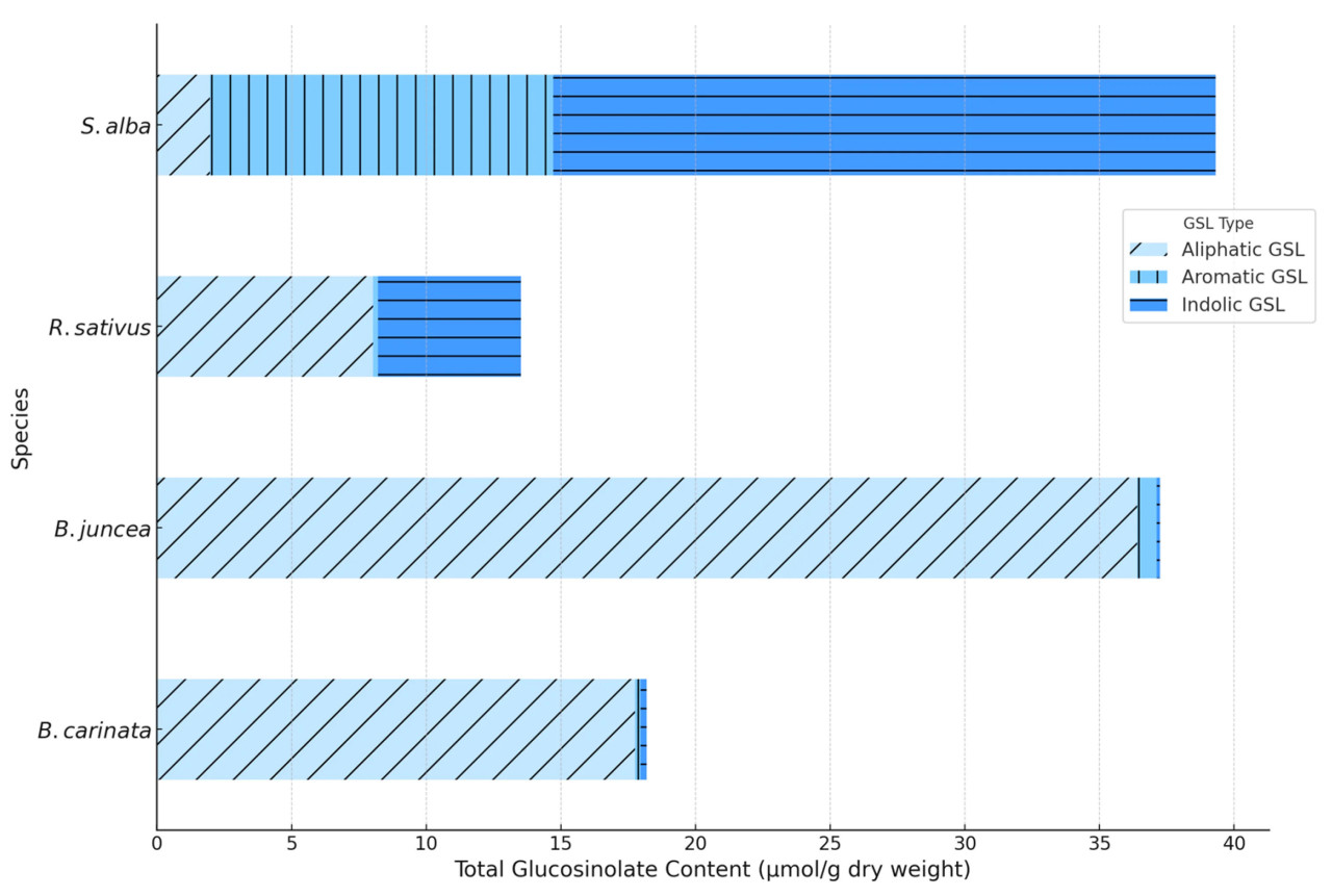 Среди исследованных видов наиболее устойчивый алифатический профиль GSL продемонстрировала B. juncea , за ней следует B. carinata , что подтверждает её потенциал для стратегий биофумигации, направленных на более сильное фунгицидное действие. Напротив, R. sativus демонстрирует более смешанный профиль, сочетающий алифатические и индольные GSL. Такое разнообразие может быть полезным в условиях с более широким спектром патогенов и подчёркивает её полезность в ротационной биофумигации с различными профилями GSL.