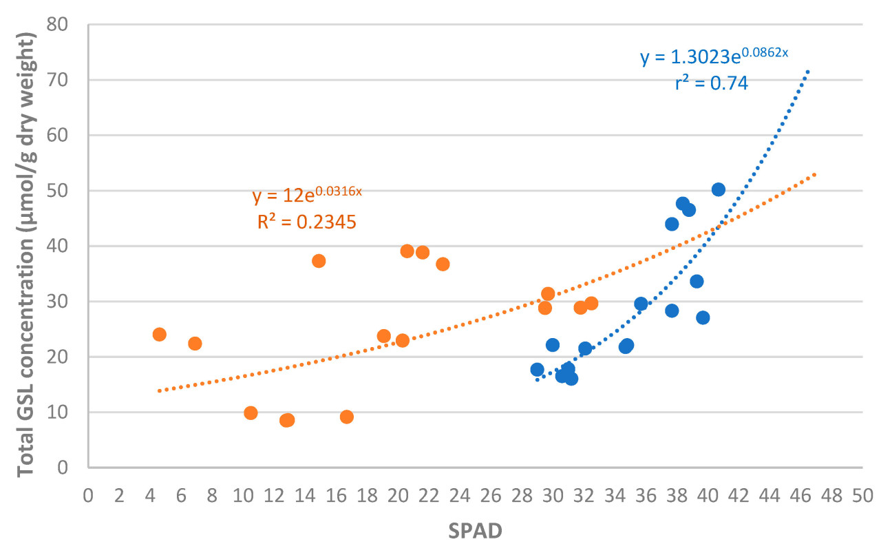 На рисунке 8 графически показана зависимость между общей концентрацией GSL в биомассе видов биофумиганта и SPAD в образцах, отобранных в январе и марте 2023 года. В образцах, отобранных в январе 2023 года, эта зависимость является последовательной (r 2 = 0,74), демонстрируя экспоненциальную зависимость: чем выше SPAD, тем выше концентрация GSL.