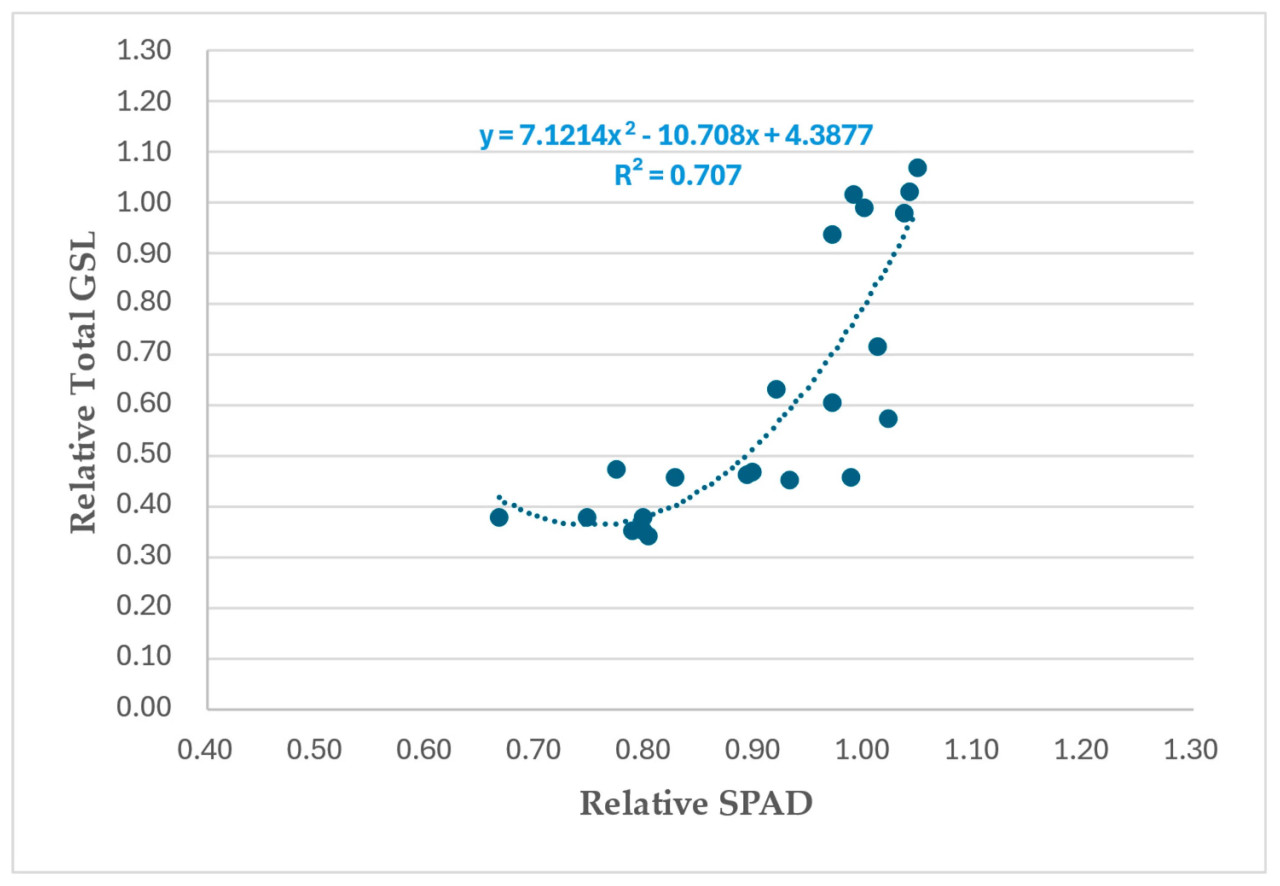 Как уже упоминалось, значения SPAD, а также концентрация и профили GSL, по-видимому, сильно зависят от видов или связаны с ними. Однако на оба параметра влияют многие другие факторы окружающей среды и агрономического управления. В связи с этим при анализе результатов за несколько лет необходимо выражать результаты в относительных единицах по сравнению с эталоном, чтобы исключить влияние дополнительных источников вариации, которые могут исказить анализ этой взаимосвязи. В данном случае в качестве эталонного вида был выбран B. juncea , поскольку он показал самую высокую концентрацию GSL и, наряду с B. carinata , также входил в число видов с самыми высокими значениями SPAD.