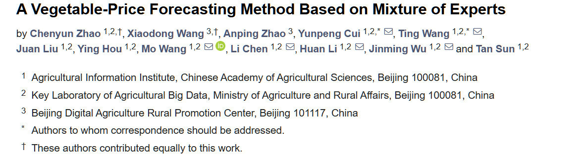 Zhao C, Wang X, Zhao A, Cui Y, Wang T, Liu J, Hou Y, Wang M, Chen L, Li H, et al. A Vegetable-Price Forecasting Method Based on Mixture of Experts. Agriculture. 2025; 15(2):162. https://doi.org/10.3390/agriculture15020162