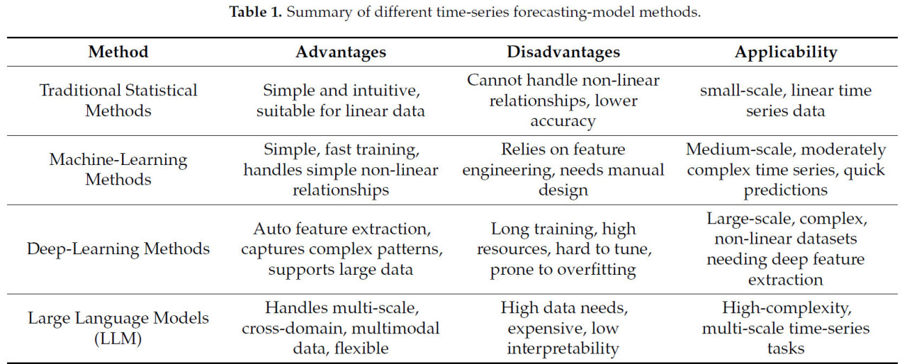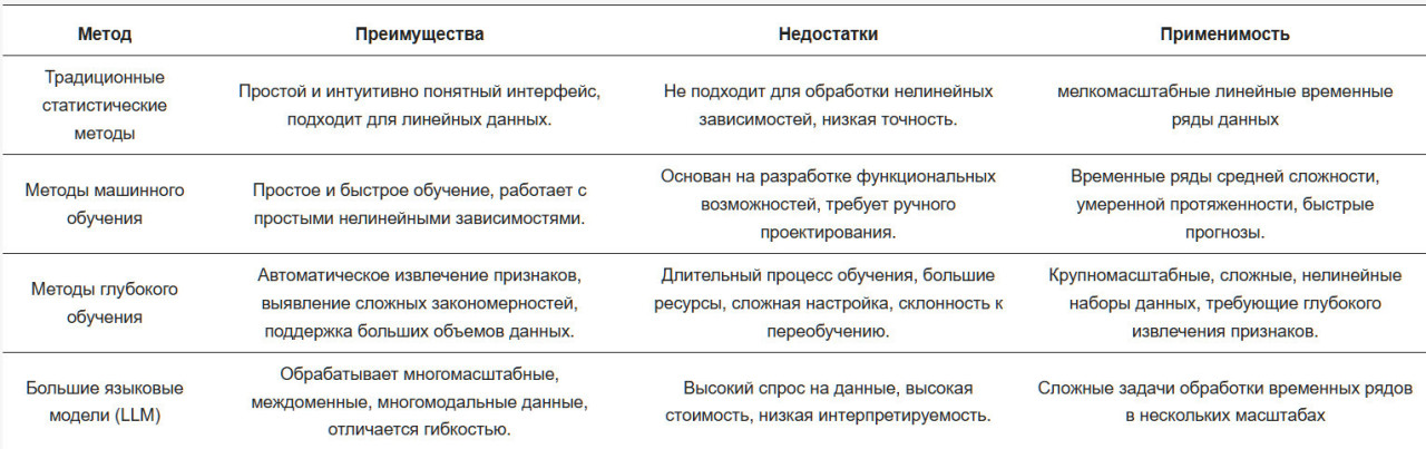 Таблица 1. Сводка различных методов моделей прогнозирования временных рядов.