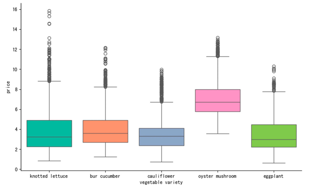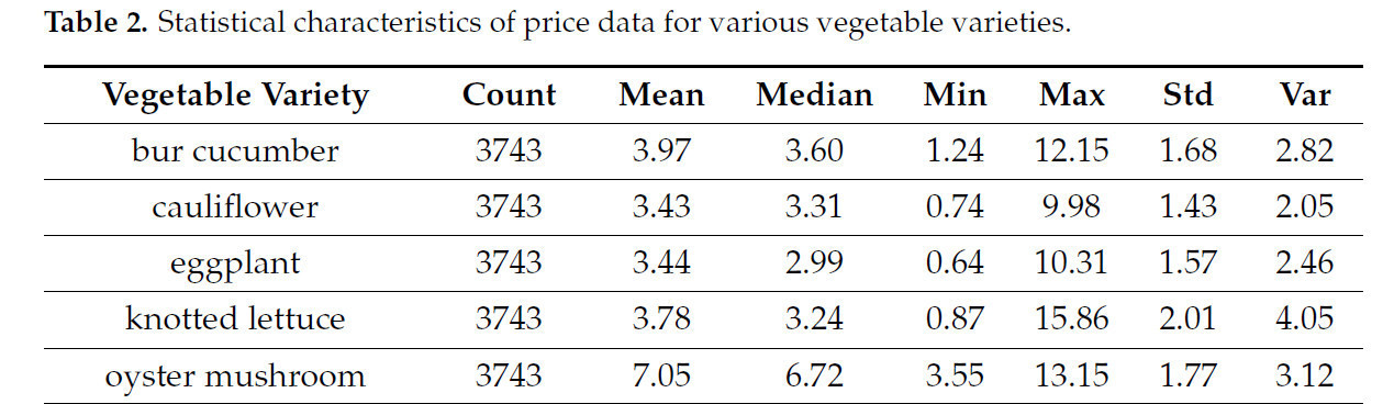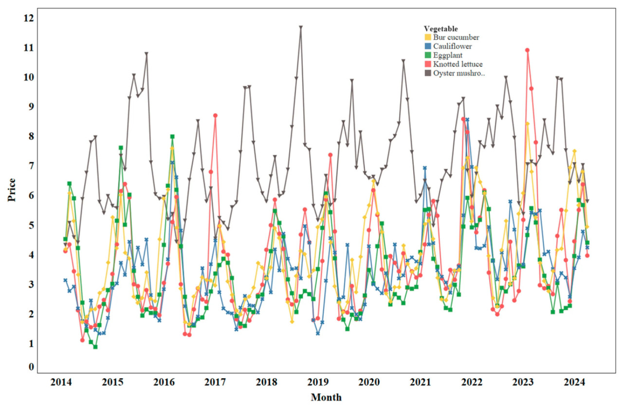 В данной статье используются данные о среднесуточных ценах на различные сорта овощей с 1 января 2014 года по 31 марта 2024 года, собранные на семи крупных оптовых рынках в Пекине, Китай (оптовые рынки Синьфади, Юэгэчжуан, Даянлу, Шимэнь, Балицяо, Шуйтунь и Цзиньсю Дади). Все данные были собраны авторитетными государственными органами, имеют обширный временной охват, что гарантирует надежность и точность данных, обеспечивая тем самым всесторонний обзор и анализ колебаний цен на овощи. Наборы данных включают корнишон (bur cucumber), вешенку (oyster mushroom), цветную капусту, кочанный салат (knotted lettuce) и баклажан. Эти пять сортов овощей были выбраны из четырех основных категорий — листовые овощи, пасленовые овощи, овощи длительного хранения и съедобные грибы. Из каждой категории было выбрано от одного до двух видов овощей, чтобы обеспечить репрезентативную выборку, отражающую разнообразные характеристики производства овощей и рыночных условий.