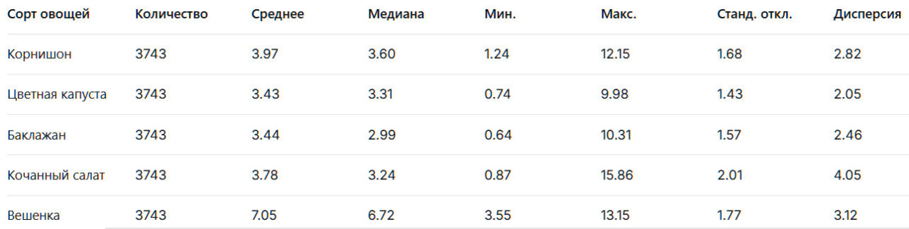 Таблица 2. Статистические характеристики данных о ценах для различных сортов овощей.