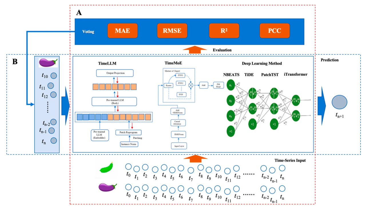 Мы предлагаем новый подход к прогнозированию цен на овощи, VPF-MoE, использующий MoE для интеграции передовых больших языковых моделей и методов глубокого обучения, доказавших свою эффективность в прогнозировании временных рядов. Архитектура VPF-MoE проиллюстрирована на Рисунке 3. Процесс обучения и процесс применения показаны как Рисунок 3A и Рисунок 3B соответственно.