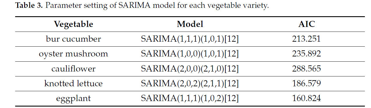 Процесс моделирования SARIMA включает три основных этапа: стационаризация данных, определение параметров и установление модели. Информационный критерий Акаике (AIC) использовался для выбора оптимальной комбинации параметров, а тест Льюнга – Бокса применялся для проверки адекватности модели. В Таблице 3 приведены оптимальные параметры SARIMA, определенные для каждого сорта овощей.