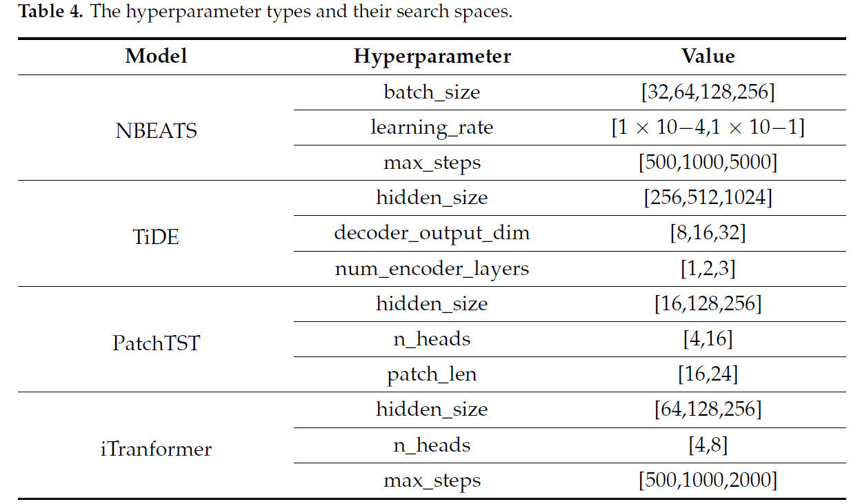 Процесс обучения использовал среднеквадратическую ошибку (MSE) в качестве функции потерь и использовал фреймворк Ray Tune для оптимизации гиперпараметров. Ray Tune выполняет интеллектуальный поиск в пределах определенного пользователем пространства гиперпараметров с использованием байесовской оптимизации [37]. Количество испытаний сэмплирования было установлено равным 10. Гиперпараметры, настраиваемые в процессе оптимизации, включали размер пакета (batch size), скорость обучения и количество шагов обучения. Конкретно, `batch_size` относится к количеству образцов данных, используемых в каждой итерации обучения, при этом меньшие размеры пакетов потенциально могут ускорить процесс обучения. Скорость обучения контролирует размер шага обновления параметров в алгоритме оптимизации; если скорость обучения слишком велика, модель может не сойтись во время обучения. Установка соответствующего диапазона поиска для скорости обучения может удовлетворить различные потребности обучения. `max_steps` определяет количество итераций для обучения модели. Кроме того, существуют специфические для модели параметры, такие как параметр `patch_len` в PatchTST, который позволяет модели захватывать сегменты временных рядов разной длины. Параметры `num_encoder_layers` и `decoder_output_dim` определяют количество слоев энкодера и размерность выхода декодера соответственно. Эти параметры значительно влияют на производительность и выразительную способность модели (Таблица 4).