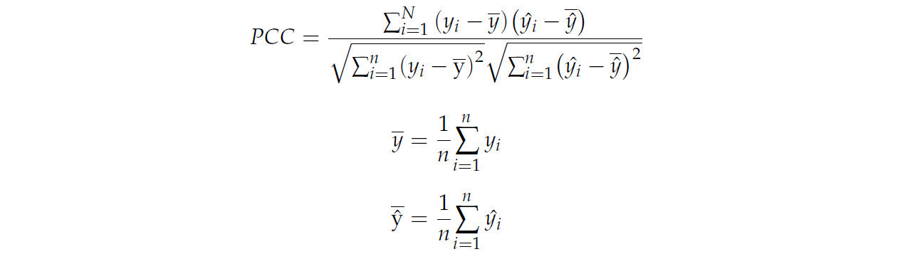 Четыре метрики оценки использовались для оценки производительности модели: средняя абсолютная ошибка (MAE) [40], среднеквадратическая ошибка (RMSE) [41], R2 и коэффициент корреляции Пирсона (PCC). Метрики вычислялись следующим образом: