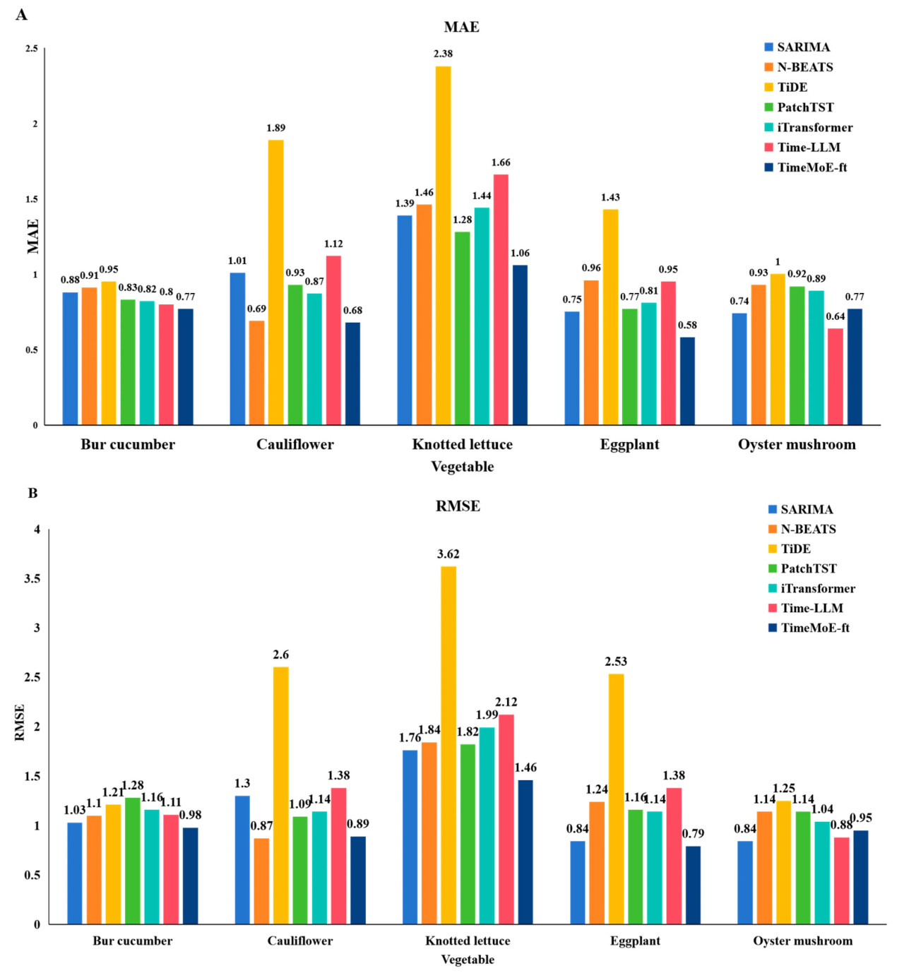 Рисунок 4. Сравнение существующих методов в прогнозировании ежемесячных цен на овощи с использованием MAE и RMSE в качестве метрик: (A) MAE; (B) RMSE.