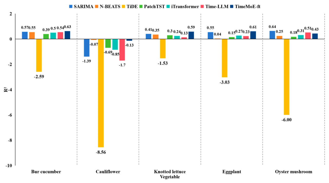 Из Рисунка 5 видно, что прогностическая производительность различных методов значительно варьируется в зависимости от типа овощей. Традиционный метод SARIMA демонстрирует низкие значения R2 для большинства типов овощей и даже отрицательные значения для некоторых (например, корнишона и цветной капусты), что указывает на плохую подгонку (fitting). Это подчеркивает их ограничения в моделировании сложных ценовых колебаний и нелинейных трендов. Методы глубокого обучения, такие как PatchTST, N-BEATS и iTransformer демонстрируют более высокие значения R2 для большинства овощей, таких как кочанный салат и цветная капуста, указывая на сильные возможности подгонки. Однако их производительность колеблется для некоторых овощей, таких как корнишон и баклажан. В частности, PatchTST и TiDE показывают нестабильность в некоторых случаях. Среди всех методов TimeMoE-ft показывает наилучшую общую производительность. Он достигает значительно более высоких значений R2, особенно для корнишона и баклажана, демонстрируя свое превосходство в способности захватывать сложные нелинейные взаимосвязи. Time-LLM работает немного хуже, чем TimeMoE-ft, но все же превосходит традиционные методы и некоторые модели глубокого обучения для некоторых овощей, таких как цветная капуста.