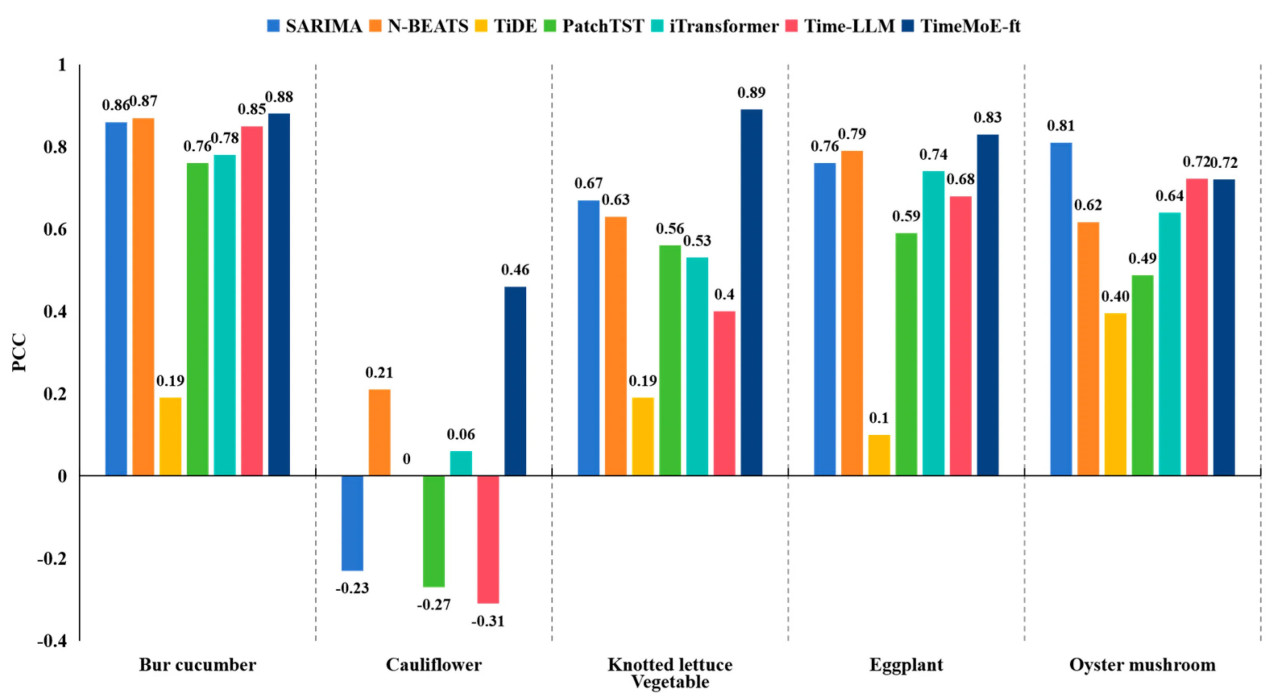 Как показано на Рисунке 6, значения PCC метода глубокого обучения TiDE относительно низки для большинства сортов овощей. Традиционный метод SARIMA демонстрирует отличную производительность в прогнозировании кочанного салата и вешенки. В то же время большая языковая модель TimeMoE-ft достигает наилучшей общей производительности, но уступает SARIMA для вешенки.