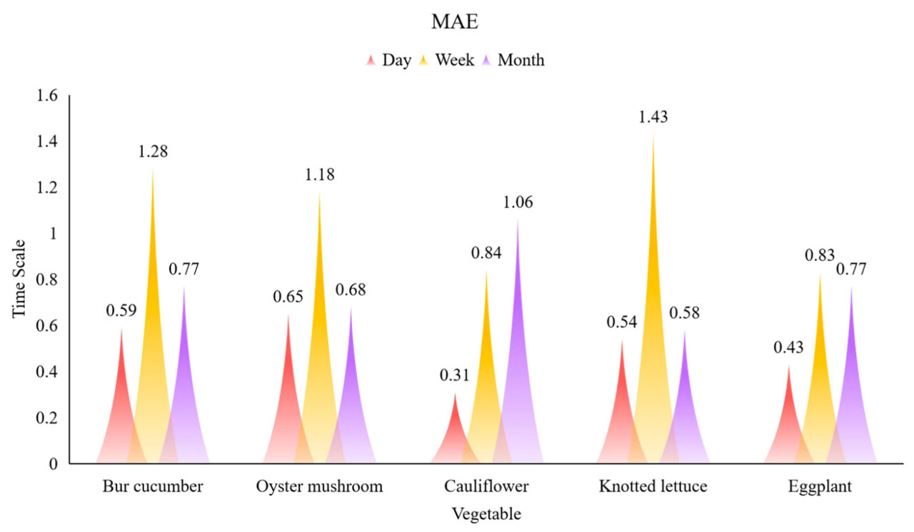 Поскольку TimeMoE-ft показывает наилучшие результаты в прогнозировании ежемесячных цен на овощи, была проанализирована его производительность на разных временных масштабах прогнозирования. Рисунок 7 иллюстрирует производительность модели TimeMoE-ft на разных овощах на трех временных масштабах прогнозирования (день, неделя и месяц) с использованием MAE в качестве метрики оценки. TimeMoE-ft достигает наилучшей производительности для прогнозирования ежемесячных цен на овощи, что указывается самыми низкими значениями MAE в большинстве случаев. Например, ежемесячные значения MAE для цветной капусты и кочанного салата (0.31 и 0.54 соответственно) значительно ниже, чем для ежедневных и еженедельных прогнозов, подчеркивая способность модели эффективно захватывать долгосрочные тренды. Еженедельные прогнозы демонстрируют умеренную производительность, со значениями MAE, как правило, ниже, чем для ежедневных прогнозов, но выше, чем для ежемесячных. Например, ежемесячные значения MAE для корнишона и вешенки составляют 0.77 и 0.68 соответственно. Напротив, TimeMoE-ft демонстрирует самые высокие значения MAE в ежедневных прогнозах цен, указывая на более низкую точность в захвате краткосрочных колебаний. Например, MAE для ежедневных прогнозов составляет 1.28 для корнишона и 1.18 для вешенки. Эти результаты предполагают, что TimeMoE-ft преуспевает в моделировании долгосрочных зависимостей и трендов, но испытывает трудности с нерегулярной и волатильной природой краткосрочных ценовых колебаний. Это подчеркивает необходимость потенциальных улучшений или гибридных подходов для повышения точности краткосрочного прогнозирования.