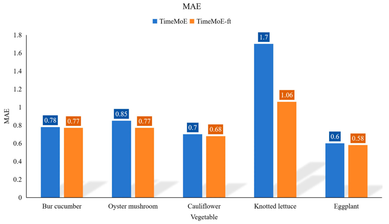 Рисунок 8. Сравнение VPF-MoE с TimeMoE и TimeMoE-ft в прогнозировании ежемесячных цен на овощи с использованием MAE в качестве метрики.