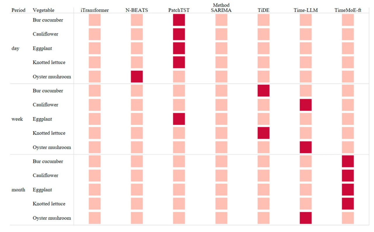 Мы провели статистический анализ оптимальных методов, используемых VPF-MoE для разных овощей на ежедневных, еженедельных и ежемесячных масштабах прогнозирования, как показано на Рисунке 9. На рисунке показано распределение выбранных методов для каждого масштаба прогнозирования, причем темные квадраты представляют модели, которые были выбраны на основе критериев оценки VPF-MoE как лучшие исполнители для конкретных задач прогнозирования овощей. Это иллюстрирует адаптивность выбранных моделей к различным распределениям данных и сценариям прогнозирования. Рисунок демонстрирует, что для ежедневного прогнозирования цен на овощи часто выбирается метод глубокого обучения PatchTST, в то время как большая языковая модель TimeMoE-ft чаще выбирается для ежемесячного прогнозирования цен на овощи. Для еженедельного прогнозирования цен на овощи используемые методы более разнообразны. Это дополнительно иллюстрирует, что разные методы демонстрируют различные характеристики производительности при прогнозировании цен на овощи, подчеркивая необходимость подхода VPF-MoE.