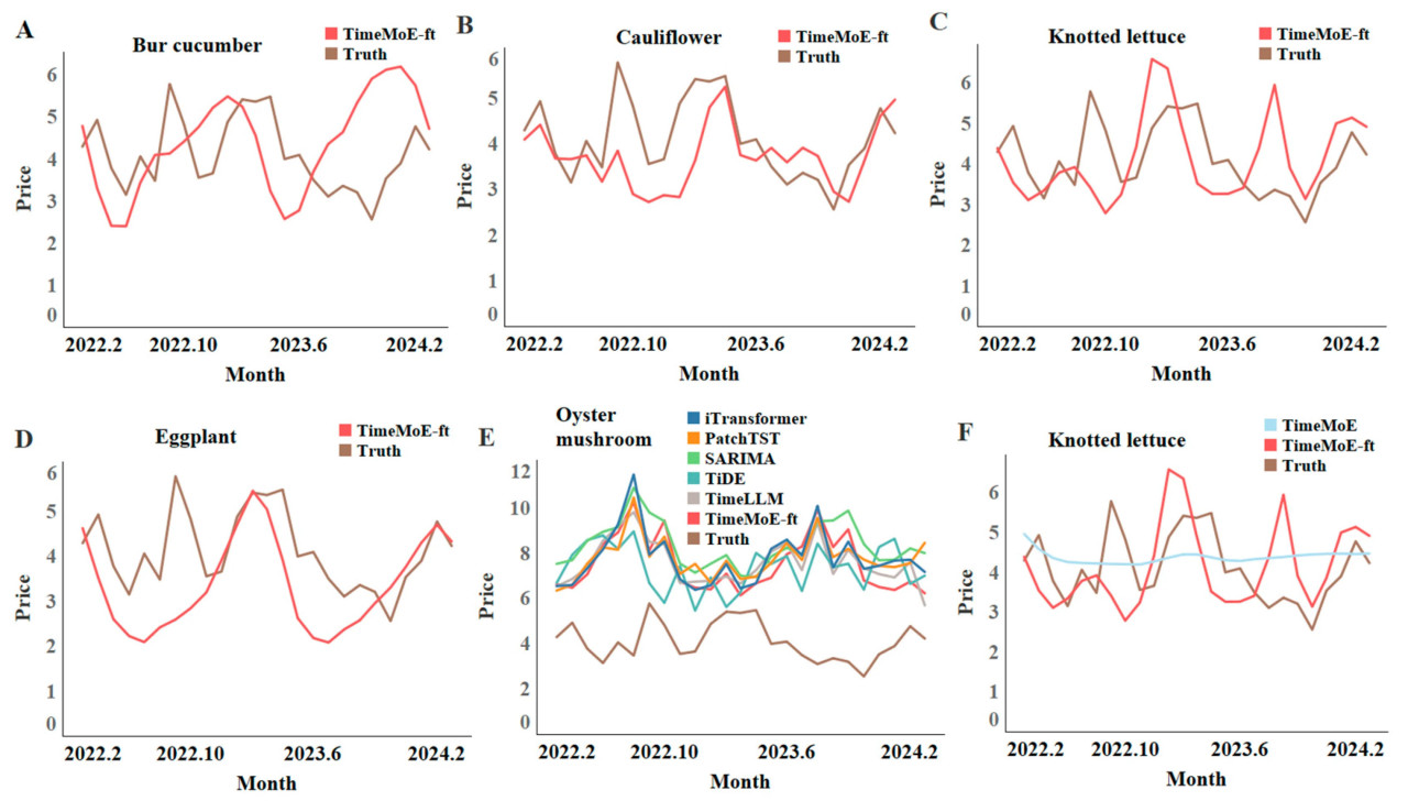 Рисунок 10A–E представляет сравнение фактических цен и прогнозируемых цен с помощью оптимальной модели, выбранной с использованием VPF-MoE, на тестовом наборе для пяти различных сортов овощей. Каждый подграфик представляет один тип овощей, при этом серая линия представляет фактические данные о ценах, а красная линия представляет прогнозируемые данные о ценах. Из рисунка видно, что прогнозируемые ценовые тенденции для пяти сортов овощей близко соответствуют фактическим рыночным тенденциям. Модель эффективно захватывает ценовые колебания; однако в месяцы с более значительной ценовой волатильностью наблюдаются некоторые отклонения прогноза. В большинстве прогнозов по овощам метод большой языковой модели TimeMoE-ft показывает хорошие результаты, но в случае с вешенкой его производительность относительно средняя. Для дальнейшего анализа мы изучили точность прогнозирования всех методов по отношению к фактическим ценам, как показано на Рисунке 10E. Результаты выявляют значительное расхождение между прогнозируемыми и фактическими ценами, указывая, что текущие модели еще не полностью захватили закономерности и тенденции, присущие кривой цен на вешенку. Кроме того, в прогнозировании цен на кочанный салат мы сравнили соответствие прогноза TimeMoE до и после дообучения и обнаружили, что дообучение значительно улучшило способность TimeMoE лучше соответствовать фактической ценовой кривой, подчеркивая оптимизирующий эффект дообучения на TimeMoE.