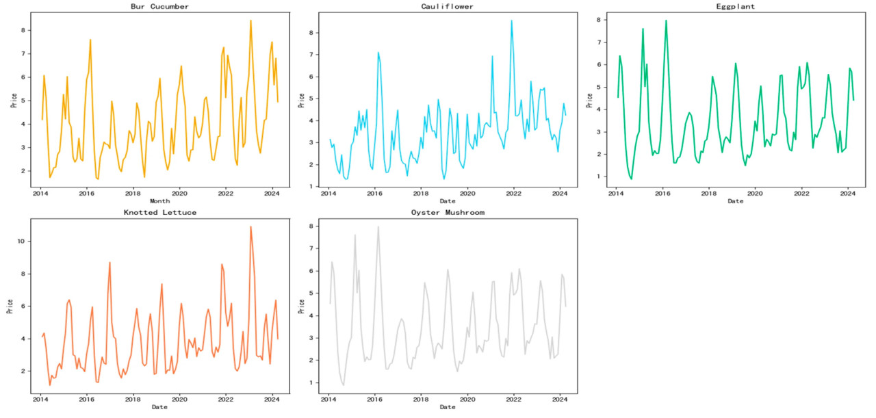 Как показано на Рисунке 1, линейный график представляет общие ценовые колебания различных сортов овощей за последние десять лет. Анализ выявляет отчетливые закономерности ценовых вариаций среди типов овощей, однако все они демонстрируют заметные сезонные колебания. В частности, вешенка демонстрирует более высокую общую цену по сравнению с другими сортами, с отчетливо отличной тенденцией ценовых колебаний. Напротив, корнишон, цветная капуста, кочанный салат и баклажан показывают схожие общие уровни цен и демонстрируют относительно согласованные закономерности колебаний. Эти сорта обычно демонстрируют циклические и сезонные вариации, характеризующиеся более высокими ценами в зимние и весенние месяцы и более низкими ценами летом и осенью. От прогностических моделей требуются возможности подчеркивать сезонный характер цен на овощи и обеспечения базового понимания ценовой динамики.