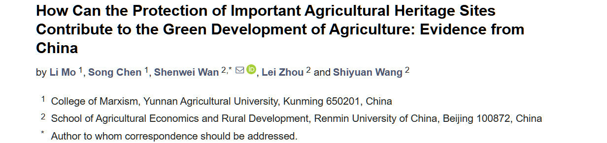 Перевод статьи «How Can the Protection of Important Agricultural Heritage Sites Contribute to the Green Development of Agriculture: Evidence from China» авторов Mo L, Chen S, Wan S, Zhou L, Wang S., оригинал доступен по ссылке. Лицензия: CC BY. Изменения: переведено на русский язык