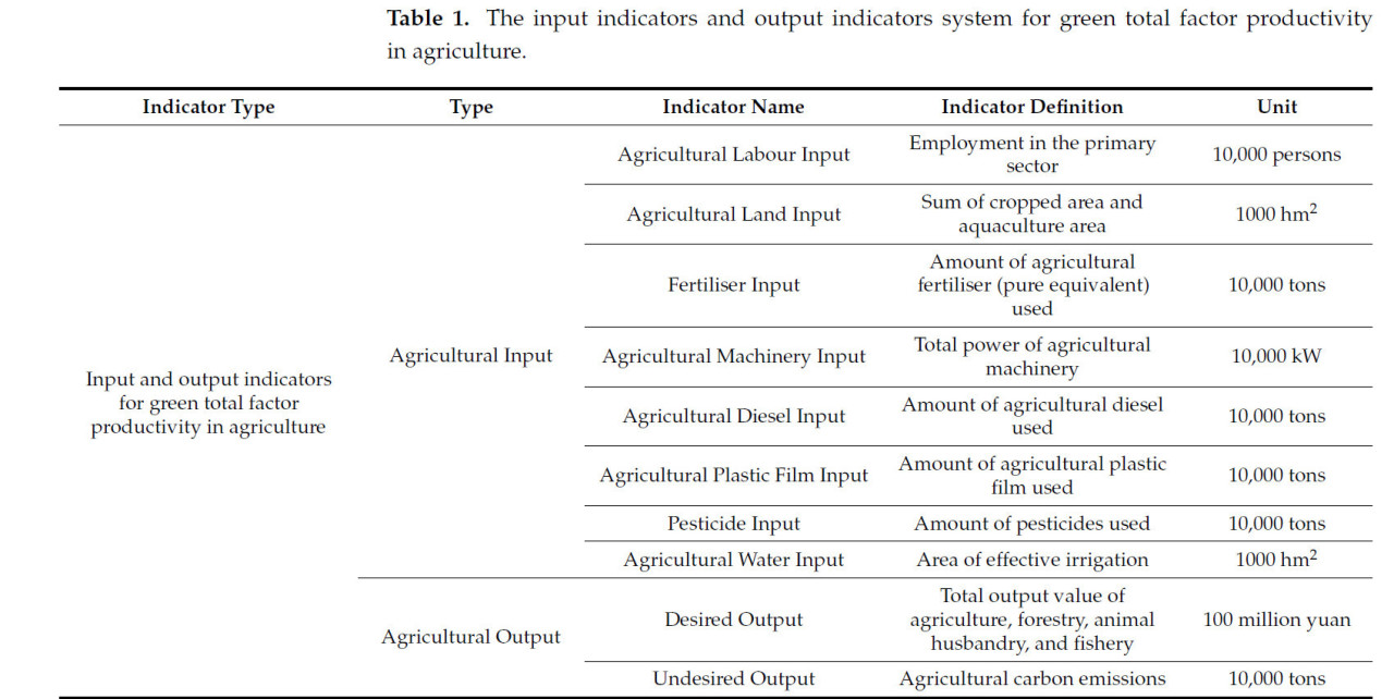 Ссылаясь на существующие исследования [47,48], показатели затрат и выпуска, используемые при расчете совокупной факторной производительности зеленого роста в сельском хозяйстве, представлены в таблице 1.