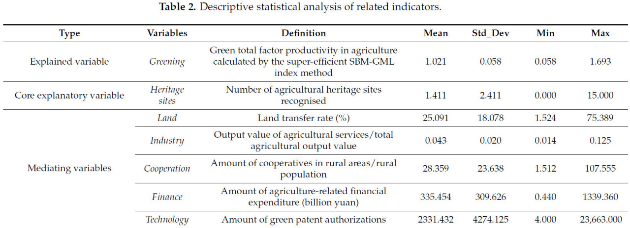В данной статье защита объектов сельскохозяйственного наследия (Heritage sites) рассматривается как ключевая объясняющая переменная, и используется общее количество объектов всемирного сельскохозяйственного наследия (GIAHS) и объектов сельскохозяйственного наследия, имеющих национальное значение в Китае (China-NIAHS), успешно утвержденных в каждой провинции Китая с 2001 по 2021 год, в качестве количества признанных важных объектов сельскохозяйственного наследия. Это связано с тем, что увеличение количества признаний отражает повышение осведомленности общества о защите объектов сельскохозяйственного наследия, что, в свою очередь, способствует взаимному продвижению практик защиты, прояснению целей защиты и накоплению практического опыта. Более того, ссылаясь на существующее исследование [45], количество признаний может быть использовано в качестве показателя для количественной оценки эффективности защиты и интуитивного отражения прогресса работы по защите.