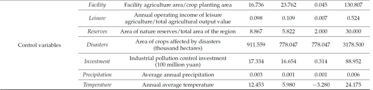 Кроме того, чтобы избежать эмпирической ошибки, вызванной пропущенными переменными, ссылаясь на существующее исследование [49], мы в основном выбрали контрольные переменные из трех аспектов. Во-первых, в сельском хозяйстве мы выбрали три переменные: тепличное сельское хозяйство (отраженное соотношением площади тепличного сельского хозяйства к площади посевов сельскохозяйственных культур) (Facility), агротуризм (отраженный соотношением годового операционного дохода от агротуризма к общему объему сельскохозяйственного производства) (Leisure) и площадь сельскохозяйственных бедствий (Disasters). Во-вторых, в области охраны окружающей среды мы выбрали две переменные: создание природных резерватов (отраженное соотношением площади природных резерватов к общей площади региона) (Reserves) и инвестиции в контроль промышленного загрязнения (Investment). Наконец, в природной среде мы выбрали две переменные: среднегодовое количество осадков (Precipitation) и среднегодовая температура (Temperature).