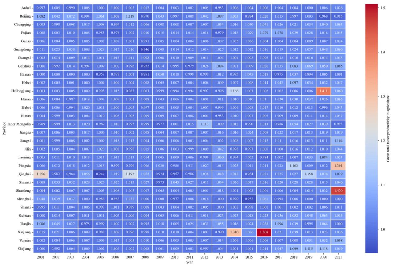 Однако, если рассматривать в контексте временных рядов, рост совокупной факторной производительности зеленого роста в сельском хозяйстве был заметно ограничен, в то время как количество объектов сельскохозяйственного наследия продолжало значительно расширяться. Это показывает, что эффективное использование объектов сельскохозяйственного наследия для улучшения экологического развития сельского хозяйства стало общей проблемой, с которой сталкиваются все провинции Китая.