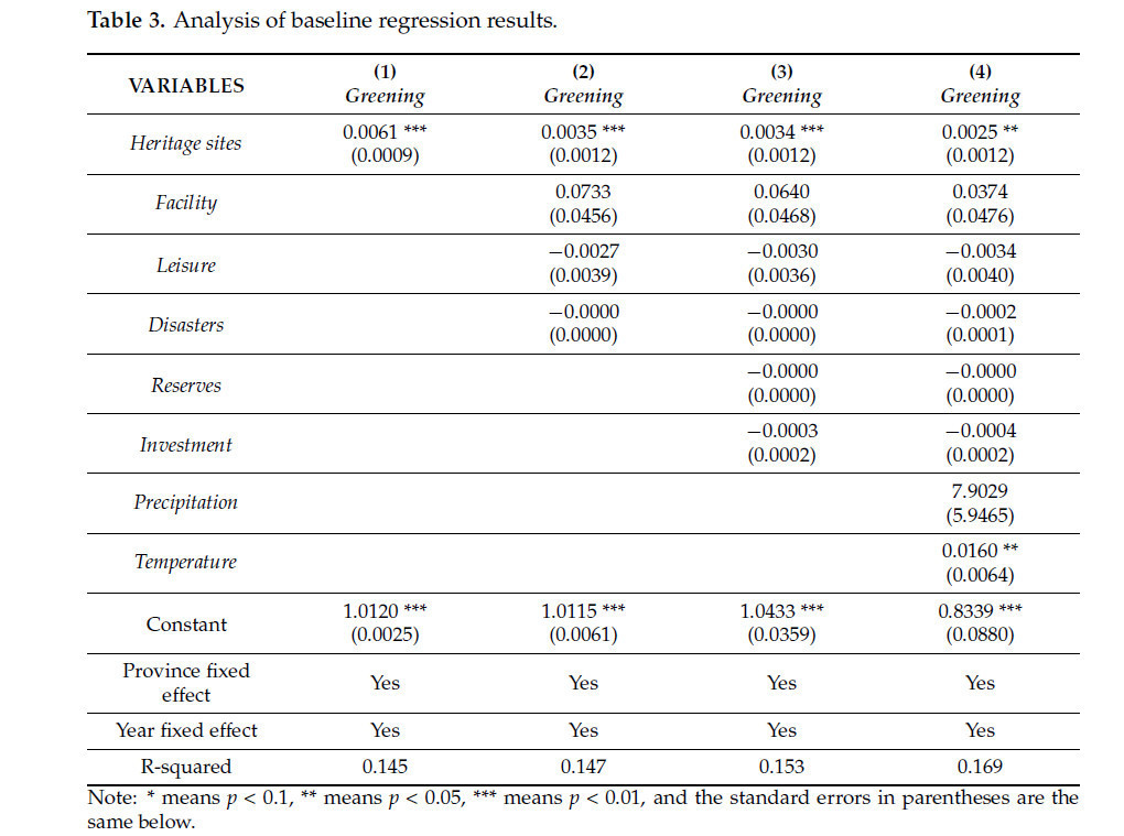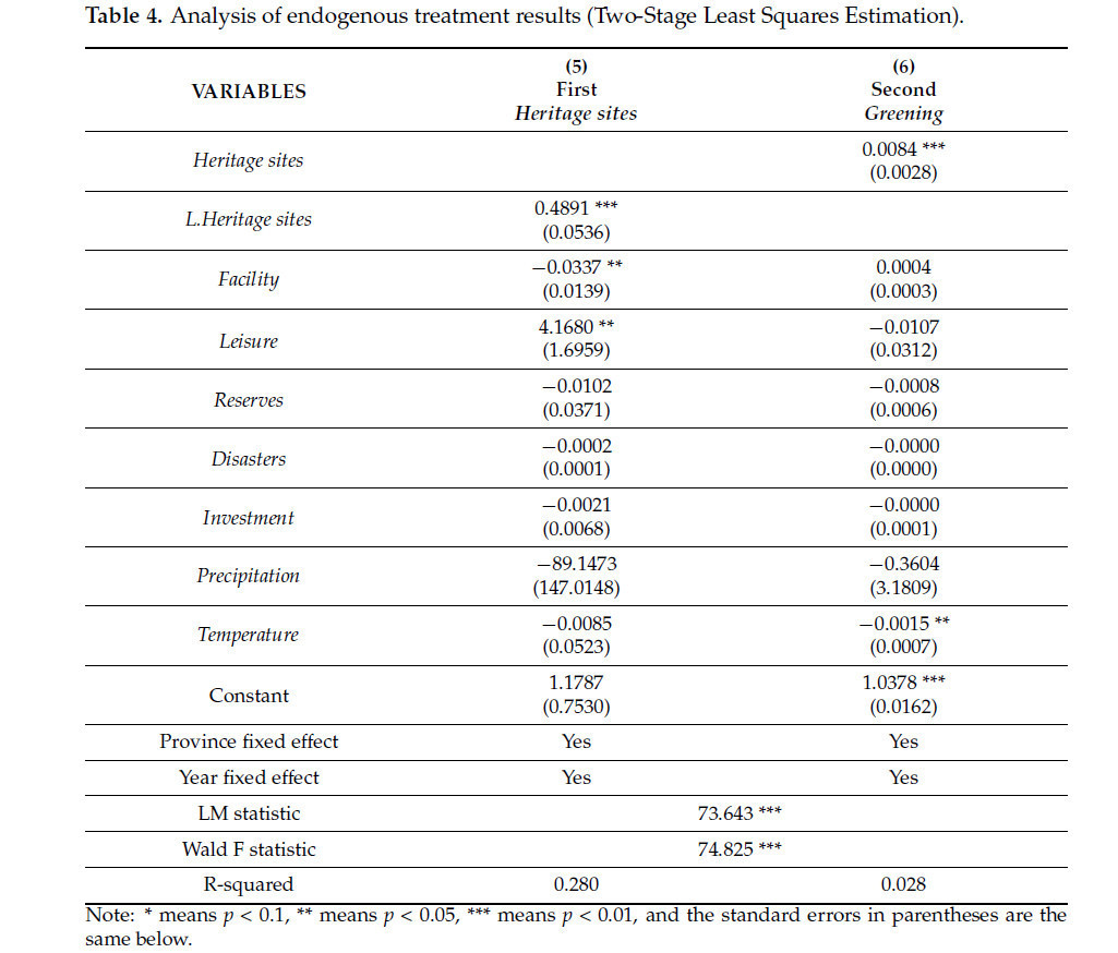 Модель 1 — это результат без контрольных переменных. Модель 2 — это результат введения контрольных переменных исключительно на сельскохозяйственном уровне. Модель 3 включает контрольные переменные на экологическом уровне в дополнение к тем, которые присутствуют в Модели 2. Наконец, Модель 4 включает контрольные переменные на уровне природной среды в дополнение к тем, которые присутствуют в Модели 3. Результаты показывают, что защита объектов сельскохозяйственного наследия оказывает положительное влияние на экологическое развитие сельского хозяйства, достигая статистической значимости на уровне 1% в Модели 1, Модели 2 и Модели 3 и на уровне 5% в Модели 4.