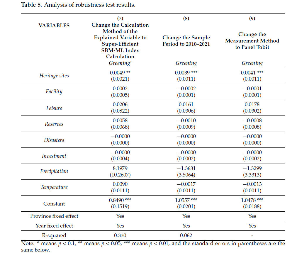 Чтобы проверить устойчивость эмпирических результатов, мы используем следующие три метода. Во-первых, мы заменяем метод расчета объясняемой переменной. Мы заменили суперэффективный индекс SBM-ML (SBM-Malmquist–Luenberger), используемый для расчета совокупной факторной производительности зеленого роста в сельском хозяйстве, который используется для измерения объясняемой переменной экологического развития, на суперэффективный метод SBM-ML. Результаты представлены в Модели 7 таблицы 5, показывая влияние защиты объектов сельскохозяйственного наследия на совокупную факторную производительность зеленого роста в сельском хозяйстве. Она все еще может показывать положительный эффект на уровне значимости 5%. Во-вторых, сокращается период выборки. Учитывая влияние длины периода выбора выборки, мы сократили период выборки до 2010–2021 годов в качестве проверки устойчивости. Результаты представлены в Модели 8 таблицы 5. В течение 2010–2021 годов влияние защиты объектов сельскохозяйственного наследия на суперэффективный SBM-ML показало, что совокупная факторная производительность зеленого роста в сельском хозяйстве все еще может оказывать положительный эффект на уровне значимости 1%. В-третьих, мы заменили регрессионную модель. Учитывая, что совокупная факторная производительность зеленого роста в сельском хозяйстве представляет собой ограниченные данные, мы изменили эмпирическую модель на панельную модель Tobit, которая используется для регрессии, и результаты показаны в Модели 9 таблицы 5, которая показывает, что в панельной модели Tobit защита объектов сельскохозяйственного наследия все еще может оказывать положительное влияние на совокупную факторную производительность зеленого роста в сельском хозяйстве на уровне значимости 1%.