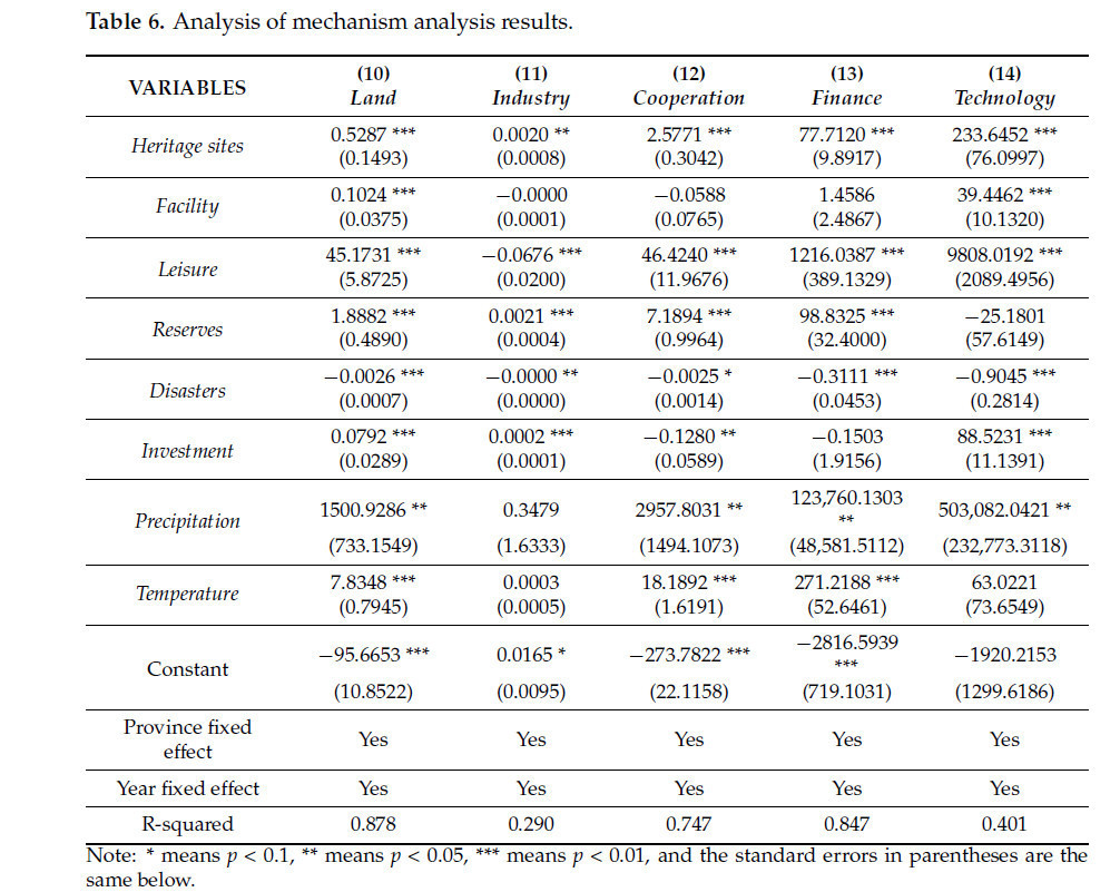 Во-вторых, защита объектов сельскохозяйственного наследия может способствовать: совершенствованию структуры аграрной промышленности, повышению уровня оборота земель, усилению создания новых организаций управления сельским хозяйством, увеличению финансовых инвестиций в поддержку аграрного сектора и стимулированию экологических технологических инноваций. Было установлено, что все пять этих каналов проходят проверку на наличие посреднического эффекта.