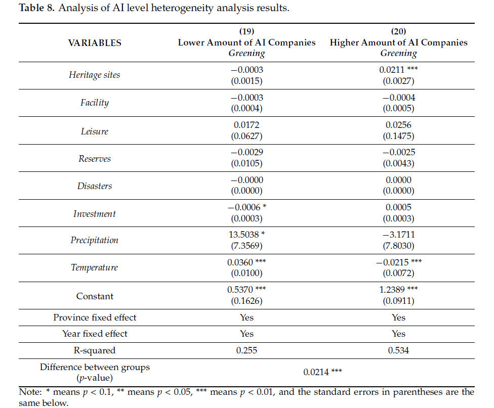 В контексте быстрого развития цифровой экономики и информационных технологий наблюдается заметный рост интеграции технологии ИИ с сельским хозяйством [51]. Эта интеграция также распространилась на цифровое лесное хозяйство и экологическое лесное хозяйство, особенно в области защиты и продвижения объектов сельскохозяйственного наследия. Примерами этой интеграции являются использование дронов для опрыскивания и сбора урожая, внедрение интеллектуальных систем орошения и надзора, а также создание платформы обмена большими данными сельскохозяйственной информации. Одновременно, когда ценность объектов сельскохозяйственного наследия признается, местные органы власти часто сотрудничают с предприятиями для создания онлайн-платформ для работы и используют новые медиа и другие каналы для стимулирования наследия. Следовательно, количество местных компаний ИИ повлияет на эффективность защиты объектов сельскохозяйственного наследия в контексте экологического развития сельского хозяйства. Принимая во внимание вышеупомянутые факторы, количество компаний ИИ в каждой провинции на ежегодной основе используется для отражения уровня ИИ данной провинции за конкретный год. Впоследствии данные дихотомизируются на две категории, причем медиана служит точкой разграничения. Провинции, демонстрирующие меньшее количество компаний ИИ, чем медиана, классифицируются как имеющие низкое количество компаний ИИ, в то время как те, у которых количество компаний ИИ на уровне медианы или выше, классифицируются как имеющие высокое количество компаний ИИ. Результаты групповой регрессии представлены в таблице 8. Результаты Модели 19 показывают, что в провинциях с низким уровнем объектов сельскохозяйственного наследия положительное влияние его защиты на продвижение экологического развития сельского хозяйства не является статистически значимым. Напротив, Модель 20 показывает, что для провинций, демонстрирующих повышенный уровень ИИ, внедрение защиты объектов сельскохозяйственного наследия не дает заметного положительного воздействия на экологическое развитие сельского хозяйства, и положительный эффект развития является статистически значимым в пределах доверительного интервала 1%. В то же время результаты прошли комбинированный тест Фишера, указывая на то, что существовала разница между двумя группами на уровне значимости 1%.