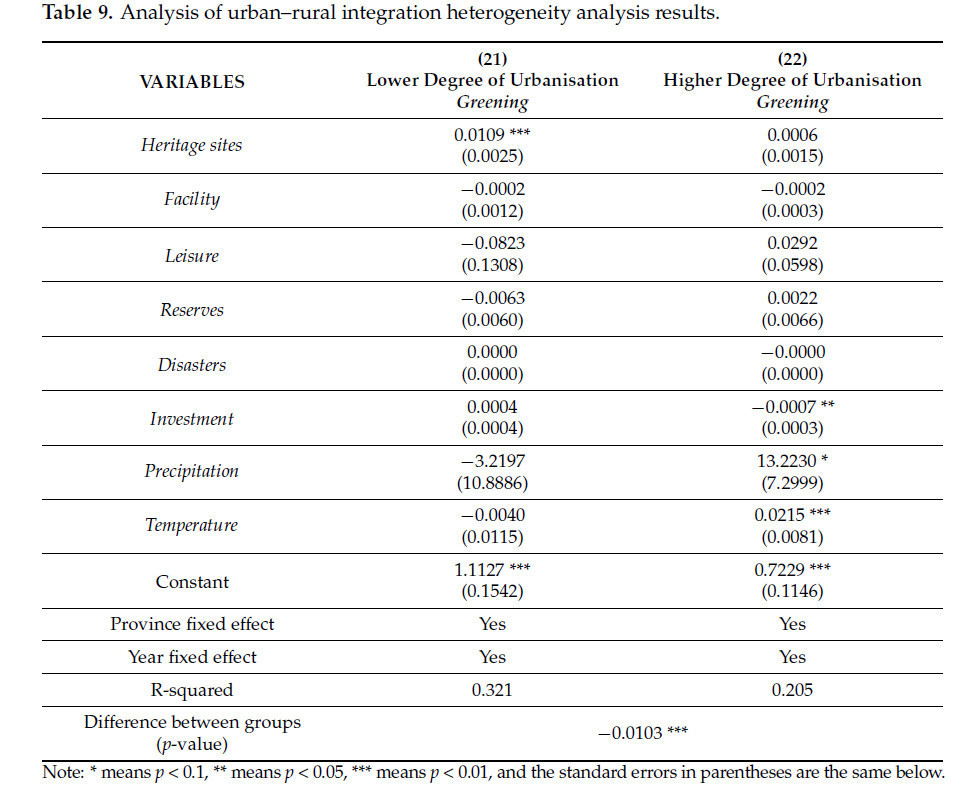 Одним из наиболее важных процессов в защите объектов сельскохозяйственного наследия является интеграция городских и сельских районов [52]. Уровень интеграции города и деревни повлияет на сложность защиты объектов сельскохозяйственного наследия, что, в свою очередь, повлияет на роль защиты объектов сельскохозяйственного наследия в содействии экологическому развитию сельского хозяйства. Соответственно, уровень урбанизации используется в качестве прокси-переменной для интеграции города и деревни, с разделением согласно медианному значению уровня урбанизации. Те значения, которые ниже медианы, определяются как представляющие более низкую степень урбанизации, в то время как те значения, которые равны или выше медианы, определяются как представляющие более высокую степень урбанизации. Результаты групповой регрессии показаны в таблице 9. Результаты Модели 21 показывают, что для провинций с более низкой степенью урбанизации защита объектов сельскохозяйственного наследия оказывает положительное влияние на экологическое развитие сельского хозяйства, достигая статистической значимости на уровне 1%. Напротив, для провинций с более высокой степенью урбанизации положительное влияние защиты объектов сельскохозяйственного наследия на экологическое развитие сельского хозяйства не является статистически значимым. В то же время результаты прошли комбинированный тест Фишера, указывая на то, что существовала разница между двумя группами на уровне значимости 1%.