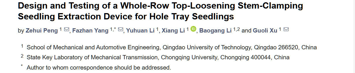 Peng Z, Yang F, Li Y, Li X, Li B, Xu G. Design and Testing of a Whole-Row Top-Loosening Stem-Clamping Seedling Extraction Device for Hole Tray Seedlings. Agriculture. 2025; 15(2):165. https://doi.org/10.3390/agriculture15020165