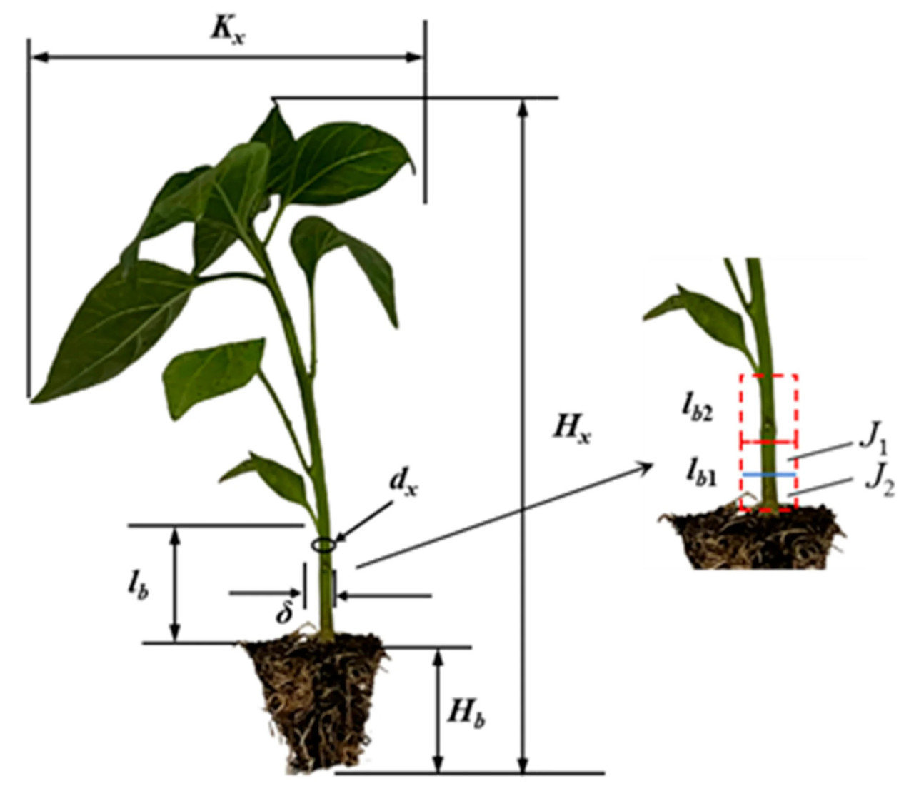 Сквозная операция с верхним рыхлением и захватом стебля включает такие действия, как выталкивание, захват и извлечение рассады из кассет. В данном исследовании в качестве объектов испытаний были случайным образом отобраны 20 растений рассады перца в возрасте от 30 до 45 дней. Растущая среда состояла из смеси вермикулита, перлита и торфяного мха в соотношении 1:1:2. Все эксперименты проводились при комнатной температуре. Морфологические параметры и положения растений были откалиброваны, как показано на Рисунке 1, с результатами, обобщенными в Таблице 1. Механические свойства были протестированы и проанализированы с использованием анализатора текстуры TA.XT Plus с целью предоставления данных для поддержки структурного проектирования и оптимизации параметров устройства для извлечения рассады с верхним рыхлением и захватом стебля.