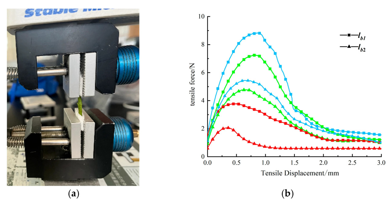 Из кривой растягивающего усилия в зависимости от перемещения, показанной на Рисунке 2b, можно наблюдать, что кривая разделена на три различных сегмента. Первый сегмент показывает стабильное увеличение прочности стебля на растяжение по мере увеличения перемещения, достигая точки разрыва. Во втором сегменте после достижения разрушающего усилия растягивающее усилие начинает уменьшаться по мере продолжения перемещения, в конечном итоге приближаясь к нулю. Третий сегмент показывает поведение после разрушения, где стебель демонстрирует значительные неупругие характеристики; растягивающее усилие больше не пропорционально дальнейшему перемещению и не увеличивается с ним. В пределах одного растения позиция захвата заметно влияет на прочность стебля на растяжение. Прочность на растяжение в сегменте lb1 больше, чем в сегменте lb2, что указывает на то, что более высокие позиции захвата приводят к снижению прочности на растяжение. Это происходит потому, что сегмент lb1, тесно связанный с блоком субстрата, имеет более высокую прочность из-за обилия питательных веществ и более толстых волокон. Однако по мере подъема позиции захвата диаметр стебля постепенно уменьшается, что приводит к снижению прочности на растяжение. Учитывая эти факторы, сегмент lb1 выбран в качестве оптимальной области извлечения. Кроме того, сегмент lb1 разделен на две части, J1 и J2, от корня до вершины, каждая длиной 10 мм. Однако, чтобы избежать помех между механизмом захвата и блоком субстрата, оптимальная область захвата определена как сегмент J1 (10–20 мм).