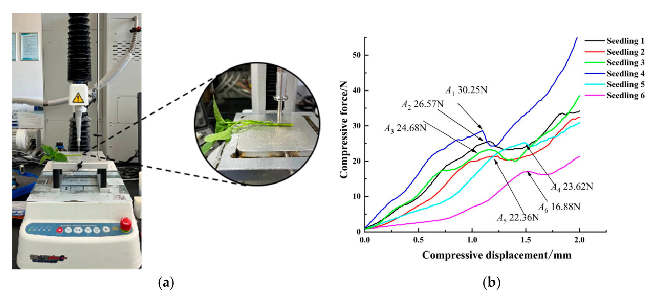 Чтобы точно оценить необходимое усилие захвата для механизма извлечения рассады и избежать повреждения стебля из-за чрезмерного сжатия, необходимо исследовать характеристики сжатия стебля. Как определено в Разделе 2.1.1, тестовая точка расположена у основания стебля рассады перца, конкретно в сегменте lb1 (0–20 мм) от корневого конца. Тест на сжатие показан на Рисунке 3а. Сначала образец помещался плоско между металлической пластиной и датчиком, угол точно регулировался, чтобы гарантировать, что стебель находится непосредственно под датчиком, обеспечивая плотный контакт и равномерное распределение усилия. В эксперименте коэффициент сжатия был установлен на 60%, что означает, что во время движения датчика вниз сжатая длина стебля составляла 60% от его диаметра. Скорость нагружения была установлена на 10 мм/мин — скорость, которая предотвращает повреждение стебля и позволяет точно собирать данные.