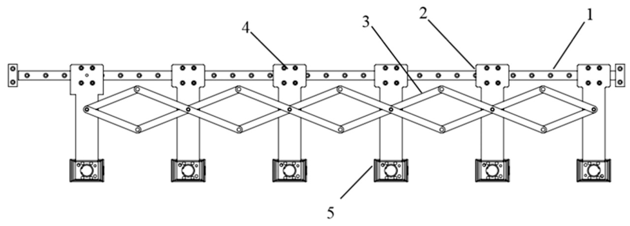 Рисунок 6. Трехмерная модель ножничного механизма. 1. Направляющая; 2. Скользящий блок; 3. Ножничная пластина; 4. Распределительная пластина для рассады; 5. Концевой эффектор для захвата рассады.