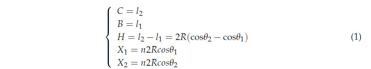 В формуле, l1 — расстояние между соседними скользящими блоками, когда ножничный механизм закрыт; l2 — расстояние между соседними скользящими блоками, когда ножничный механизм расходится; 2R — длина плеча ножничного рычага механизма; θ1 — угол между осевой линией плеча ножничного рычага и вертикальным направлением прямой пластины, когда она закрыта; θ2 — угол между осевой линией плеча ножничного рычага и вертикальным направлением прямой пластины, когда она расходится; X1 — расстояние от распределительной пластины до неподвижного конца при закрытии; X2 — расстояние от распределительной пластины до неподвижной пластины при расхождении, мм; ΔX — ход расширения и сжатия распределительного цилиндра.