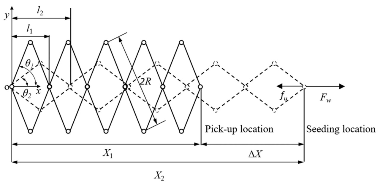 Ножничный механизм распределения рассады предлагает многочисленные преимущества, такие как низкая стоимость и простая структура. Усилие Fw приложено к свободному концу распределительного механизма, чтобы обеспечить поступательное скольжение и равноудаленное расхождение. На гибкой конвейерной цепи для рассады расстояние C между двумя соседними стаканчиками для рассады составляет 118 мм, в то время как расстояние B между двумя ячейками в стандартной кассете на 72 ячейки составляет 43 мм. Ширина скользящего блока должна быть меньше расстояния B, а ширина распределительной пластины должна быть такой же, как зазор между соседними скользящими блоками в закрытом состоянии, что также составляет 43 мм. Это гарантирует правильное совмещение стаканчиков для рассады и облегчает точный захват стеблей. Прямоугольная система координат установлена с началом в неподвижном конце. Направление распределения рассады принято за ось x, а вертикальное направление — за ось y, как показано на Рисунке 7. На этой основе выводятся уравнения: