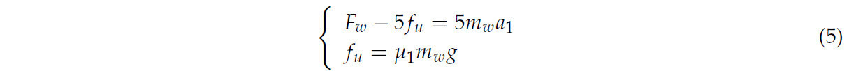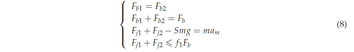 В формуле, Fw — усилие натяжения распределительного цилиндра рассады, Н; fu — трение между одиночным скользящим блоком и направляющей, Н; mw — общая масса концевого эффектора для извлечения рассады, кг.