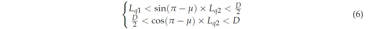 В общем случае, θ1 не должен превышать 80°, чтобы предотвратить чрезмерное увеличение усилия при втягивании цилиндра механизма ножничной вилки, так как большие углы θ1 приводят к более высоким тяговым усилиям. В то же время, θ2 должен оставаться в разумных пределах [22]: если θ2 меньше 35°, уменьшение угла мало влияет на ход ножничного механизма и может привести к нестабильности; наоборот, если θ2 превышает 50°, полный потенциал плеча ножничного рычага не может быть использован. Установив θ1 равным 76° и θ2 равным 41°, вместе с размерами, такими как l1 = 43 мм и l2 = 118 мм, и подставив эти значения в уравнения (2) и (3), получаем округленные результаты: 2R = 146 мм и изменение размера ΔX составляет 447 мм.