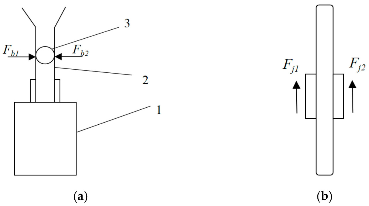 Рисунок 9. Анализ процесса усилия при захвате стебля и извлечении рассады. (a) Вид сверху; (b) Вид сбоку. 1. Цилиндр захвата рассады; 2. Захватная пластина для рассады; 3. Стебель растения в кассете.
