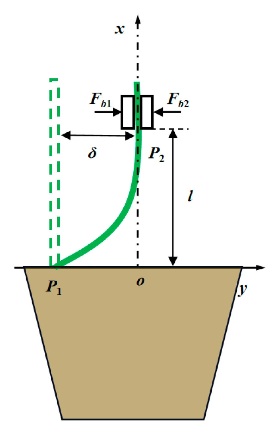 Во время процесса пересадки рассады могут возникать отклонения в совмещении стебля растения от центра кассеты, приводящие к изгибу стебля во время извлечения. Чтобы предотвратить повреждение от изгиба, необходимо решить два аспекта: во-первых, оптимизировать структуру концевого эффектора захвата, чтобы избежать повреждения, и, во-вторых, установить соответствующую высоту захвата, чтобы минимизировать травму, связанную с изгибом. Данное исследование анализирует стебель рассады перца, который можно смоделировать как равномерный тонкий стержень с одним закрепленным концом и другим свободным (игнорируя его собственный вес, как показано на Рисунке 10). Основное внимание уделяется определению того, как точно установить высоту захвата на основе механических свойств изгиба стебля, чтобы обеспечить минимальное повреждение во время процесса захвата. Система координат установлена с центром кассеты в качестве начала координат O, осевое направление стебля — как ось x, а радиальное направление — как ось y. Точка P1 представляет закрепленный конец стебля растения на кассете, а точка P2 обозначает позицию захвата. hr — длина изгиба стебля (высота захвата).