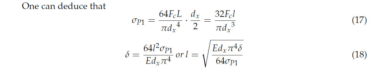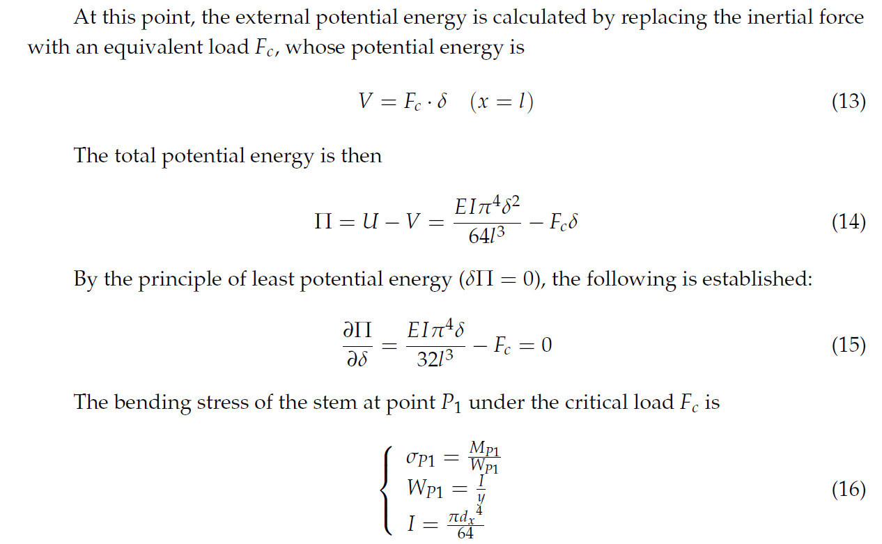 В формуле, dx — диаметр стебля; E — модуль упругости стебля; WP1 — коэффициент поперечного сечения изгиба; I — момент инерции поперечного сечения; y — центробежное расстояние стебля; σP1 — напряжение изгиба поперечного сечения в нижней точке P1.