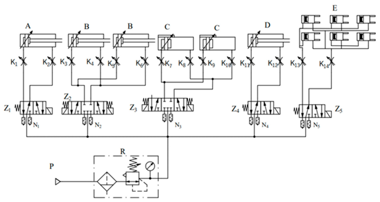 Рисунок 11. Схема пневматической цепи. P — Источник воздуха; R — редуктор; Zi — Управляющий соленоидный клапан; Ki — Дроссельный клапан; Ni — Глушитель; A — Цилиндр выталкивания рассады; B — Подъемный цилиндр; C — Цилиндр скользящего стола; D — Цилиндр распределения рассады; E — Цилиндр захвата.