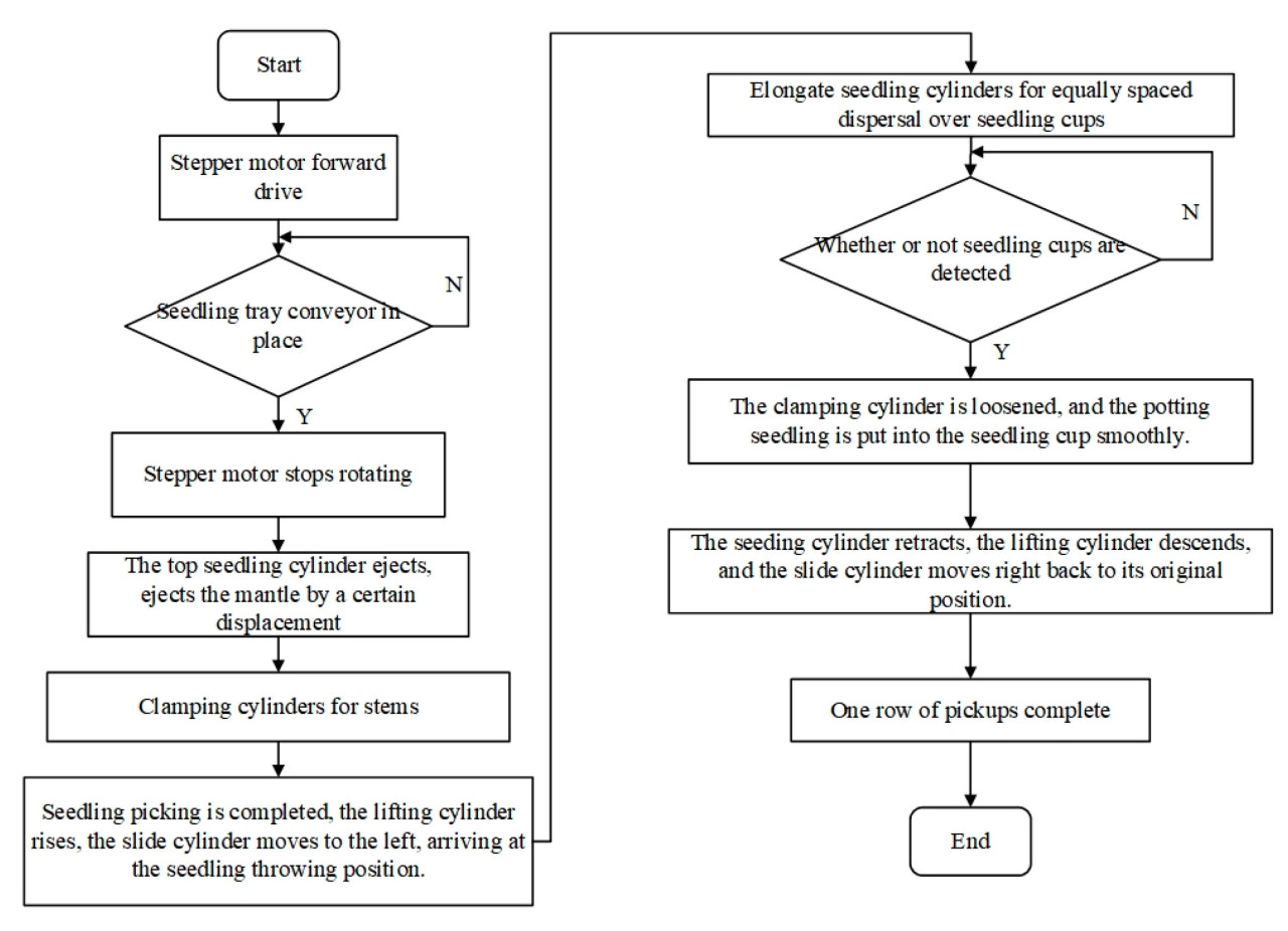 Используя 72-ячеечную кассету для рассады перца в качестве объекта исследования, были проведены испытания механических характеристик стеблей рассады. На основе результатов была установлена модель усилия в процессе захвата, что привело к оптимизации механизма захвата. Кроме того, была разработана кинематическая модель механизма распределения рассады для оптимизации проектирования его ключевых параметров. Электрические и пневматические цепи автоматической системы извлечения рассады были спроектированы на основе контроллера ПЛК, чтобы обеспечить плавную работу системы и соответствовать проектным требованиям.