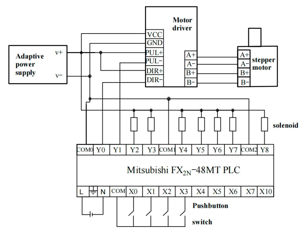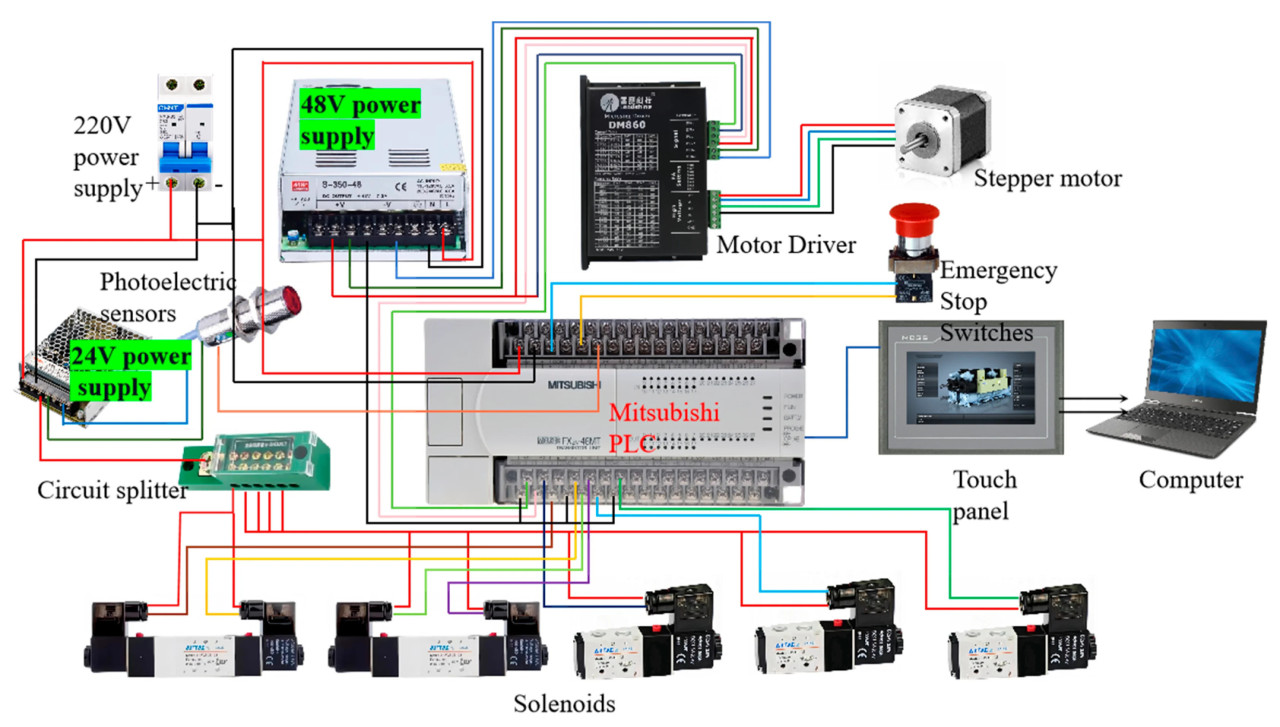 На основе принципа работы системы извлечения рассады и путем использования сенсорного экрана в качестве контроллера верхнего уровня для управления системой ПЛК, которая, в свою очередь, управляет всем процессом извлечения и размещения рассады, выбранная модель сенсорного экрана — это встраиваемый сенсорный экран TPC7032kt от компании Kunlun Tongtai. Этот сенсорный экран имеет 7-дюймовый ЖК-дисплей и четырехпроводной резистивный сенсорный экран и питается от малоэнергоемкого ЦПУ, образуя интегрированную сенсорную панель. Он оснащен как портами связи RS232, так и RS485 для прямой связи с ПЛК Mitsubishi. Редактируемая модель контроллера — Mitsubishi FX2N-48MT, которая удобна для пользователя, проста в эксплуатации и обладает высокой долговечностью. Входные сигналы поступают от кнопки пуска, кнопки паузы, аварийной кнопки остановки и фотоэлектрических датчиков, в то время как выходные сигналы приводят в действие различные соленоидные клапаны и контроллеры шагового двигателя для выполнения. Система использует вращение двигателя для обработки материалов, в то время как действия извлечения, распределения и размещения рассады выполняются пневматически. Принцип подключения показан на Рисунке 13, где планируется компоновка аппаратного соединения. Поскольку различные компоненты в системе извлечения рассады требуют разных уровней напряжения, система управления использует как источники постоянного тока на 48 В, так и на 24 В. Фактическое подключение следует этой схеме, визуально реализуя общий дизайн, как показано на Рисунке 14.
