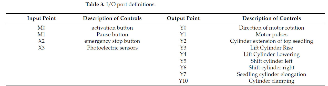 Адреса ввода и вывода контроллера ПЛК Mitsubishi назначены, как показано в Таблице 3. После импорта предварительно запрограммированной программы в ПЛК внутренняя система управляет каждым компонентом для последовательной работы. Воздушный компрессор обеспечивает источник энергии для цилиндров, в то время как соленоидные клапаны контролируют приток и отток воздуха, тем самым регулируя движение цилиндров.