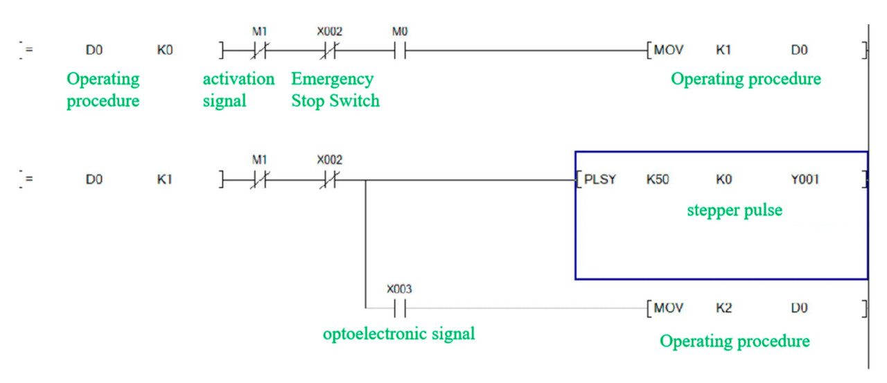 В среде программирования Mitsubishi GX-Works2 была собрана точная управляющая программа, использующая четкую иерархию инструкций последовательного управления и таймеров. Как показано на Рисунке 15, выход Y1 соответствует входному сигналу импульса для шагового двигателя, облегчая его управление и движение в программе. После разработки программы был проведен предварительный запуск теста, который включал выполнение кода без физического подключения каких-либо элементов для проверки плавной функциональности программы. После подтверждения успешного пробного запуска без проблем последовала фаза отладки системы на прототипе машины без нагрузки. Этот шаг был направлен на обеспечение того, чтобы все операционные команды были отзывчивыми и давали ожидаемые результаты. Итерируя через этот процесс, программист тонко настроил программу, чтобы соответствовать предполагаемой управляющей производительности в фактической реализации [25].