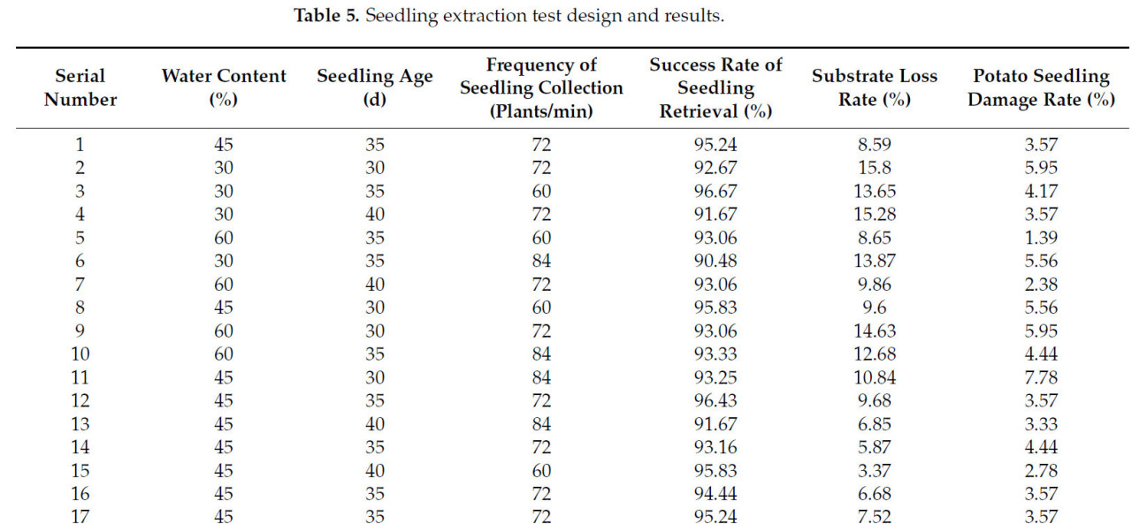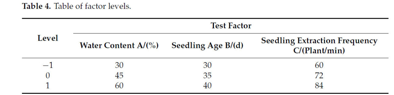Возраст рассады является ключевым фактором, определяющим толщину стебля и твердость блока субстрата, напрямую влияя на выживаемость при пересадке и толерантность, и, следовательно, на уровень повреждения. В возрасте 30 дней рассада перца проявляет умеренную прочность блока и относительно низкое перекрытие между стеблями и листьями. В 40 дней корневая система более развита, а стебли и листья становятся плотнее, увеличивая вероятность повреждения рассады. Поэтому для данного исследования была выбрана рассада возрастом 30, 35 и 40 дней. Содержание влаги тесно связано с рыхлостью блока субстрата и влияет на потери субстрата. Правильный контроль влаги обеспечивает плавное извлечение рассады и минимизирует потери субстрата. Когда содержание влаги слишком низкое (<30%), субстрат имеет тенденцию становиться рыхлым и обезвоженным; когда оно слишком высокое (>60%), прочность на сжатие блока снижается, приводя к увеличению повреждения. Следовательно, среднее содержание влаги субстрата было установлено на 30%, 45% и 60%. Частота извлечения рассады должна балансировать подачу кассеты с ритмом извлечения. Как чрезмерно высокая, так и слишком низкая частота могут негативно повлиять на эффективность и успешность. Частота, которая слишком высока, может привести к неудаче извлечения, в то время как слишком низкая частота может снизить эффективность извлечения и не соответствовать требованиям к производительности высокоэффективных пересадочных машин. Поэтому были выбраны частоты извлечения 60, 72 и 84 растения в минуту.