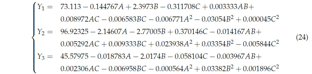 Используя программное обеспечение Design-Expert 13.0, был разработан трехфакторный трехуровневый ортогональный эксперимент, состоящий из 17 экспериментальных прогонов. Был применен метод поверхности отклика Box–Behnken для определения оптимальной комбинации параметров. Дизайн Box–Behnken представляет собой синтез статистического проектирования и экспериментальных методов; мы использовали дизайн эксперимента Box–Behnken и получили определенные данные через эксперименты. Дизайн Box–Behnken использует многомерное квадратичное уравнение для подгонки функциональной связи между факторами и значениями эффекта и ищет оптимальные параметры процесса через анализ уравнения регрессии, что является статистическим методом для решения многомерных проблем.