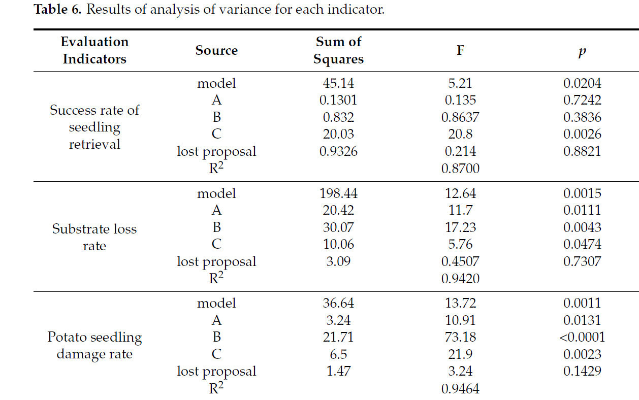 Согласно результатам ортогонального теста, содержание влаги, возраст рассады и частота извлечения рассады оказывают большее влияние на эффект извлечения; для получения наивысшей успешности извлечения рассады Y1, наименьшей скорости потери субстрата Y2 и наименьшей скорости повреждения растений в кассетах Y3 используются в качестве оценочных показателей, с установлением следующих математических моделей: